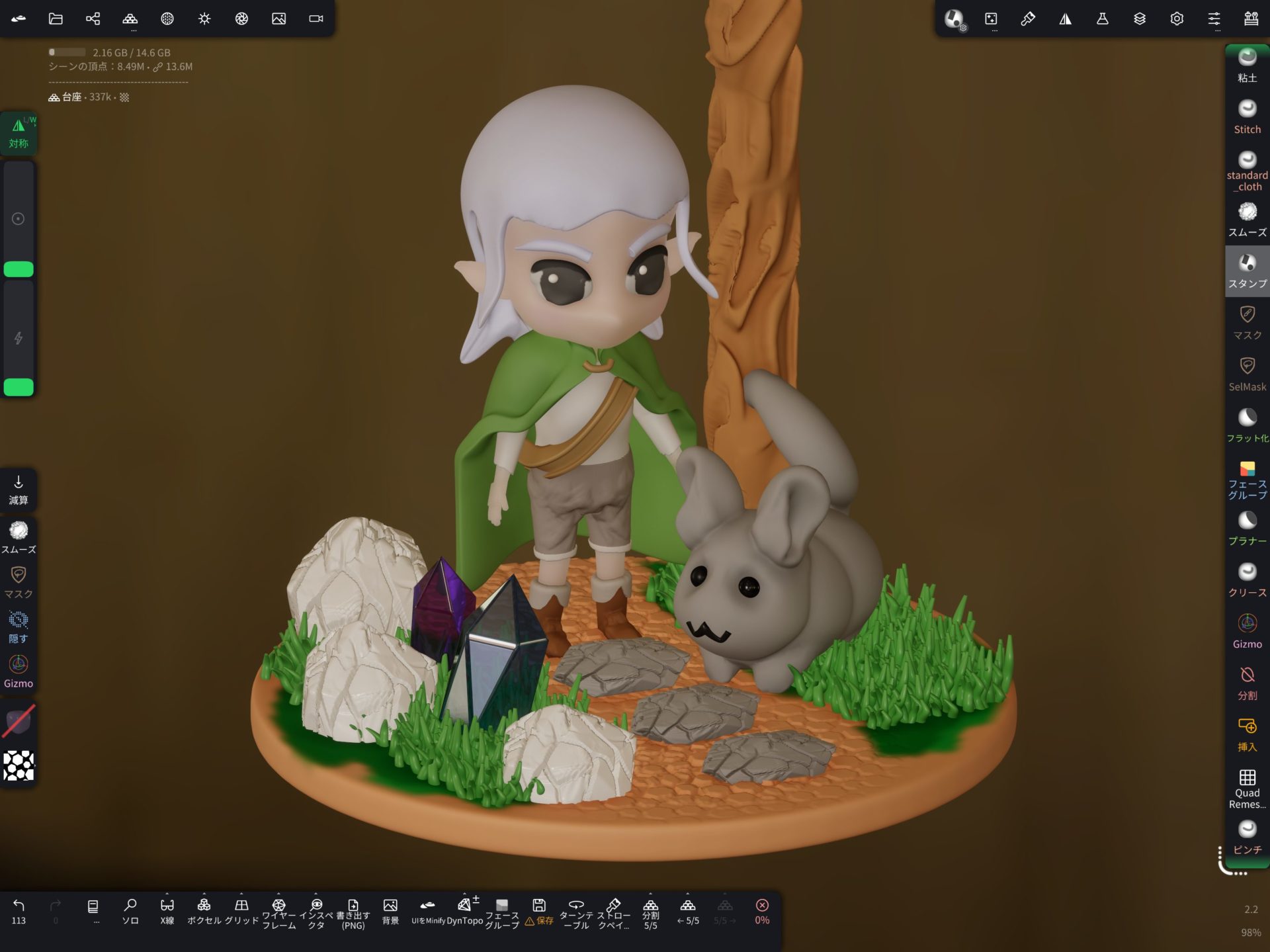 ・有料機能だけど、Quad Rmesherがローポリを維持する際に大活躍。(大きな形を作る → QuadRemsherでポリゴン数削減 → マルチレゾリューションを少しづつあげていき、柔らかい局面を得る)