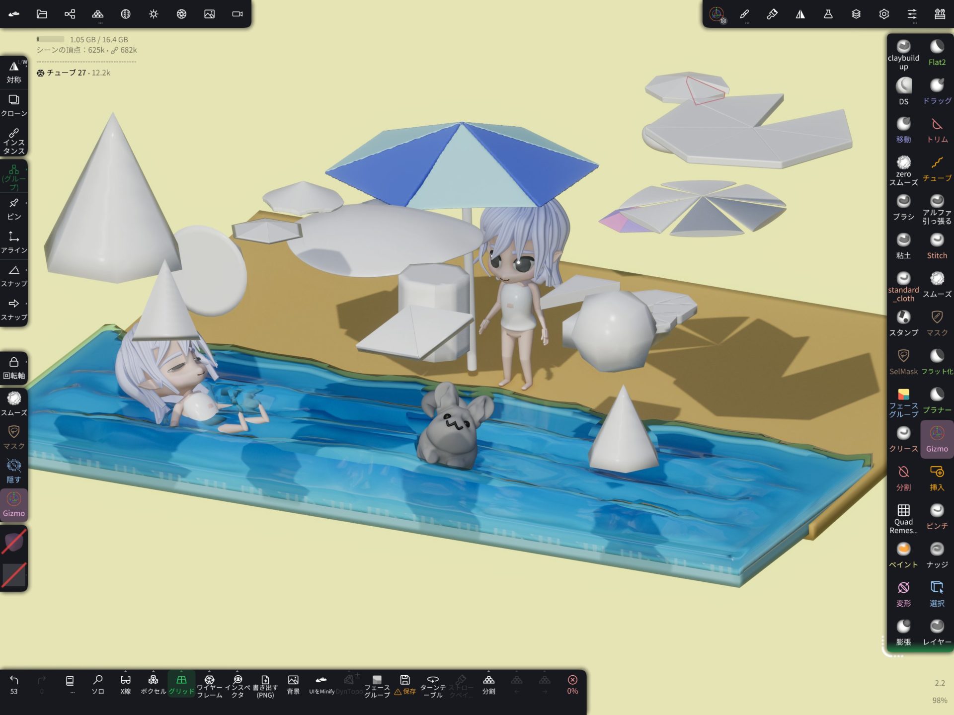 ・絵(イラスト・コンセプトアート)が描ける方は、そちらで詰めてから造形、というフローがスムースかもしれませんが、自分の場合は今のところ、造形しながら形を探る方がやりやすいため、このスタイルになっています(線をスパッと取るのが難しいのです…デジタルねんどはちょっとづつ形を絞り込んでいけるのがいいですね!)