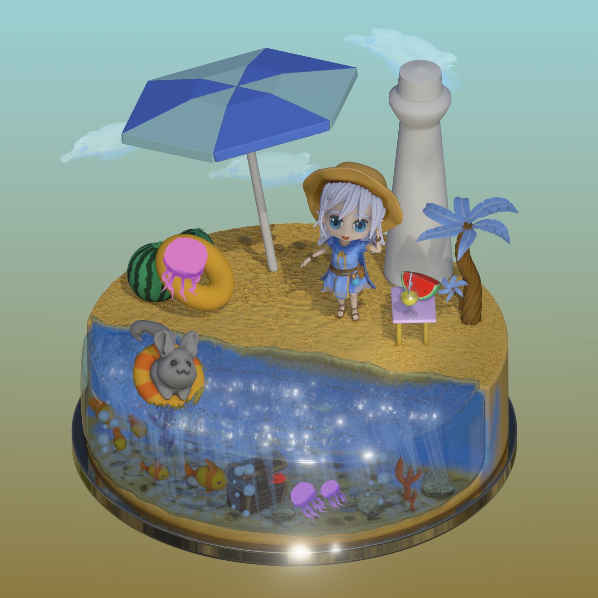 ・世界観を構築する方法は、クリエイターそれぞれだと思います!自分は前回「お話を考えてから、作品制作をした方が〜」と言っていましたが、案の定というか、先に考えていなかったので、「ビーチならスイカ割りだよな」「私は泳げないので浮き輪が必要」的な記憶から形を追加する方法となりました。(形を作ってから、それに意味づけをして、さらに想像を深めるタイプなのかもしれません)
